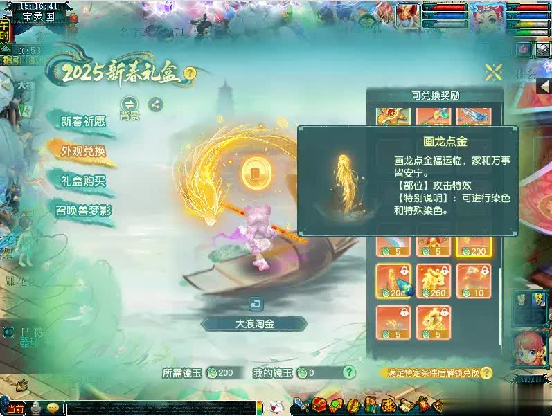 比如,最新的施法特效“大浪淘金”会消耗200点镜玉,最新的攻击特效“画龙点金”也会消耗200点镜玉,如果你想收齐全套,至少需要400点镜玉。如果你单靠抽奖的话,1点镜玉差不多对应88仙玉,400点就是35200仙玉,但如果你提前购买了锦衣,在抽奖时就能将已经拥有的道具转成镜玉,相对便宜一些。