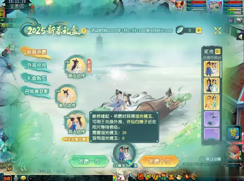 今年锦衣具有抽奖机制,单次抽奖会消耗88点仙玉。抽奖的过程中,你有机会获得锦衣、光环、背景、头像、传音、秘制红蓝和湖光境玉等道具,集齐25个镜玉可以获得一套锦衣。
